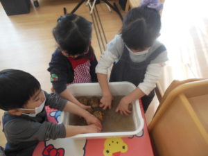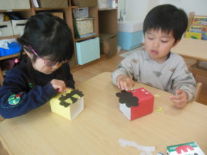 お友達と「鬼怖いね」「かわいい鬼だね」と話しながら鬼のお顔作りに夢中♪