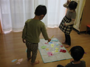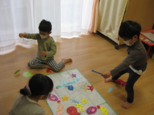今日は、室内で体操や風船遊び、魚釣りゲーム等、様々な遊びをしました。