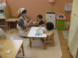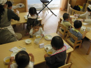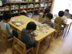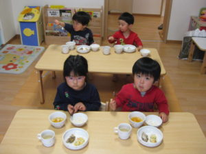午前中たくさん遊んでお腹が空いたところで給食の時間です。