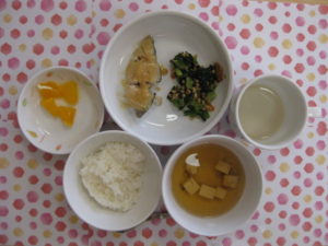 ごはん、清見オレンジ、さわら/さば味噌煮、小松菜のひじきの納豆和え、すまし汁(しいたけ、豆腐)でした😊