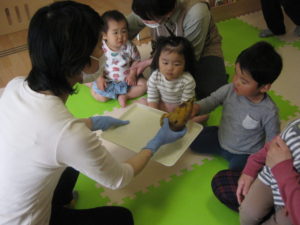 初めて見る皮付きのたけのこにドキドキ、不安そうな子もいましたが、勇気を出してツンツンと触っていました。