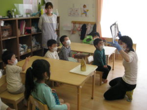 ピアノ組さんは、たけのこの本を見ながらお話を聞き、実際にたけのこに触ってみました。