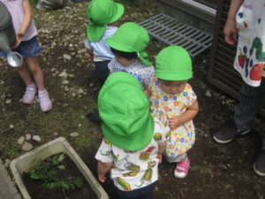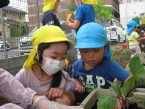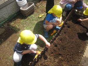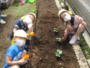 苗を置いたら、「土のお布団をかけてあげようね」とそーっと優しく土をかけてあげていました(*^^*)