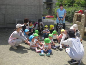 今日は、公園へおさんぽに行く前に地震の避難訓練がありました。