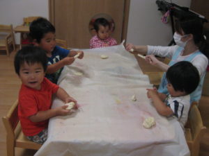 こねたて丸めたり、ちぎったりして感触を味わいました。