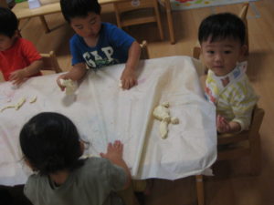 スズ組さんとタンバリン組さんは、小麦粉と水、油を混ぜた小麦粉粘土に触れました。