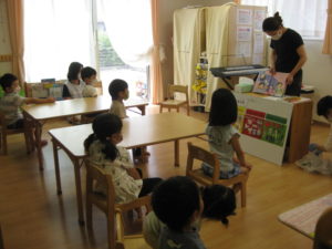 タンバリン組さんも参加し、絵本と三色食品群ボードを使ったお話をみんなで聞きました。
