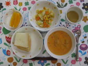 トマトクリームシチューも好き嫌いが分かれましたが食パンと一緒に頑張って食べてました。