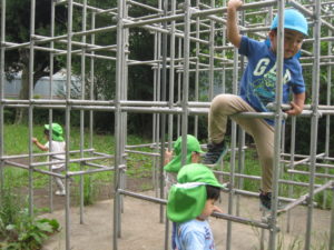ふかふかの草の上で、草花に触れたり、ジャングルジムで登ったり探検をして遊びました。