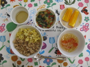 今日の給食、鶏そぼろ丼、青梗菜のトロミ煮、コンソメスープ(キャベツ.トマト)