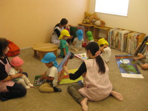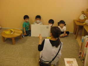 おはなしのへやがあり、はじめにみんなでそのおへやに行きました。