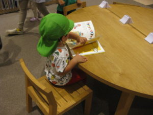いつも読んでいる絵本の大きいものを見つけて喜んでいました。
