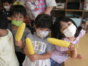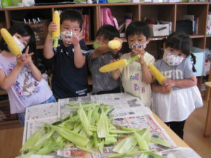 今日、ピアノ組のお友だちはとうもろこしの皮むきをしました🌽