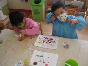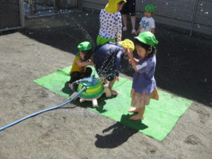 今日は園庭で、亀のスプリンクラーで遊びました😊可愛い亀で、シャワー状態で水遊びが出来るので
