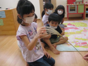 お月見のお話を聞いて、実際にススキを触ってみましたよ!!