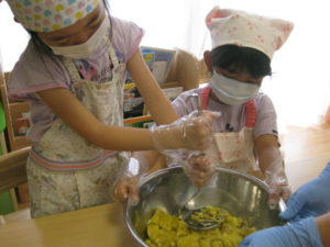 2色はかぼちゃとさつまいもです✨それぞれお砂糖と混ぜながら一生懸命つぶして・・・