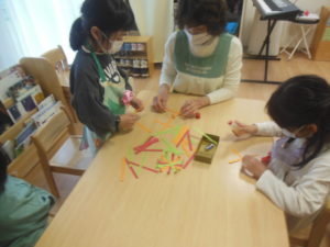 ピアノ組さんは製作をして、栗の下に付けるものを、細い紙を重ねて作りました。