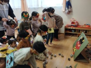 記念撮影のあとは、まめまきの歌をうたい、その次にまめまきゲームをしました。