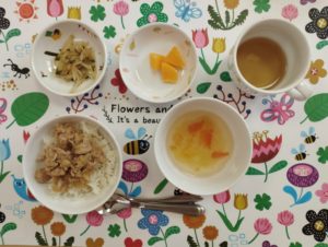 豚丼・もやしの中華風サラダ・中華スープ(長ネギ・トマト)・オレンジ