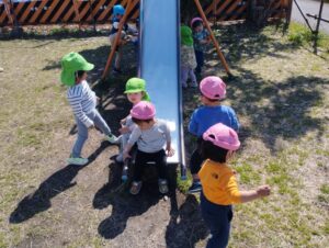 今日はみんなで新畑子ども広場へ行き、たっぷり太陽の光を浴びながら遊びましたよ!!