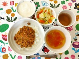 ドライカレー、キャベツのマリネ、コンソメスープ(トマト、えのき) 、ヨーグルト でした🥄