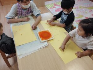 ピアノ組さんは英語の前に指絵の具で製作の背景を作りました🌼