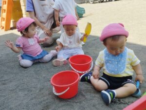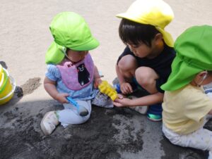 園に戻ってくるとカスタネット組さん、絵画教室を終えたピアノ組さんが・・・!一緒にお砂場遊びを楽しみました♥