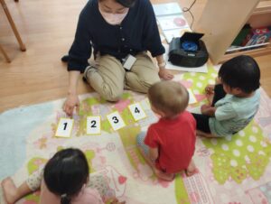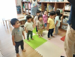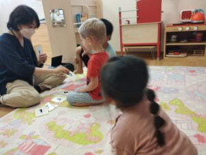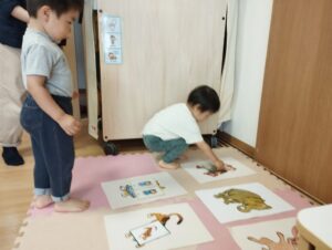 みんなで立ち上がって歌に合わせて身振りをしたり、受け取ったカードの絵と同じ動物のカードを探したりしました♬