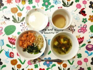 今日のお給食🍚.鮭のビビンバ・具だくさん中華スープ.ヨーグルト
