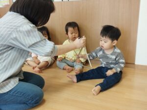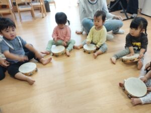 タンバリン、たたくの、楽しそう😁上手に鳴らすことが出来ていましたよ✌️始めは持つ事も触る事も、嫌〜❢と言うお友達もいたんです😆そこから考えると、すっごい成長😁😁ですね♥