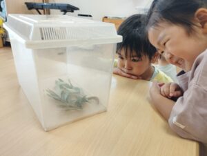 ピアノ組さんで育てている幼虫が一晩たって、体の色がピンク色に変わってきているようです😳朝から目をまんまるくして、教えてくれました!!!
