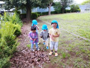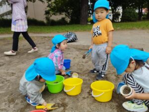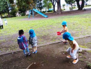 その後タンバリン組さんは砂場玩具を持って新生公園へ。