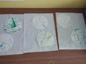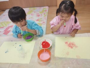 ピアノ組さんは、しゃぼん玉液に絵の具をつけて製作をしました⭐