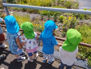 花壇を見てそれぞれ好きなお花を指さしたり、 声に出したりして伝えあっていました!