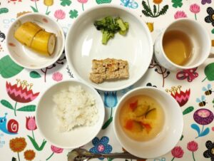今日の給食🍚ごはん・豆腐ハンバーグ.ブロッコリーのチーズ焼き.コンソメスープ(トマト.ズッキーニ)バナナ