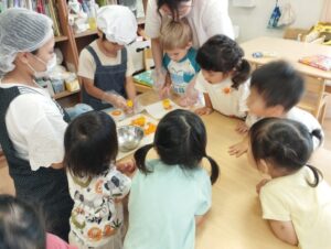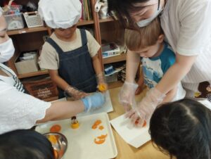 その後はピアノ組さんが、午後のおやつ「七夕そうめん」に使う人参の型抜きをしてくれました🥕