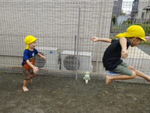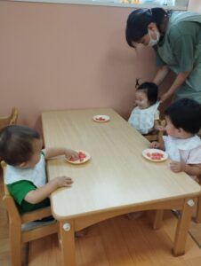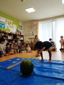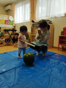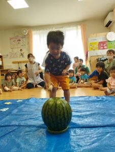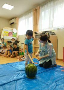 みんなの応援を受け、一人ずつスイカを叩きました。