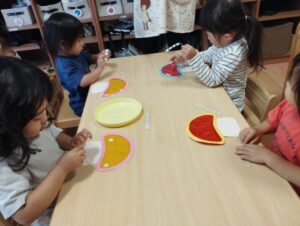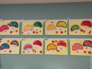目や口、模様や落ち葉を貼ってきのこを作りました