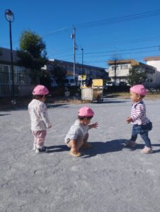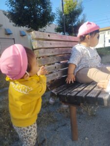 こんにちは😊先週末から、冷え込みが増してきましたね😌11月も半ばですから、仕方ないかなとは、思いますが、身体が、着いていけませんよね😥子どもたちも、鼻水や、咳などが、たえません😥今日は、日中風もさほどなく、穏やかだったので、カスタネットのお友達4人で、中神住宅内広場へお散歩に行きました✨シャボン玉で遊んだり、椅子に隠れて、いないいないば~してみたり、楽しく遊びました🎶✌️