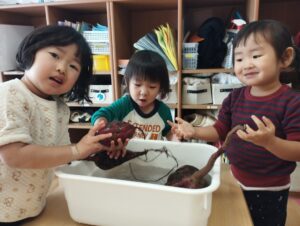 タンバリン組さんがきれいに洗ってくれた、さつまいもでピアノ組さんは自分たちのスイートポテトの形を作りました!