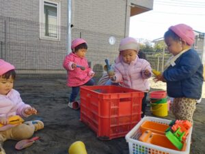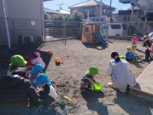 砂遊びではいろいろな道具の中から自分達の好みの物を選ぶと、カップやバケツに砂を入れたり、職員と型抜きをしたりして楽しんでいました😀