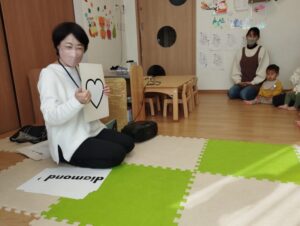 発音はちょっぴり難しそうでしたが、カードにタッチしたり、手でカードに書かれた形を作ったりとそれぞれのやり方で参加してくれました✨