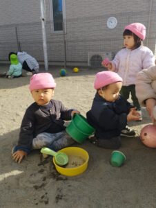 園庭では網目の容器に砂をいれて振り、大きい粒を残してお米づくりが人気でした。