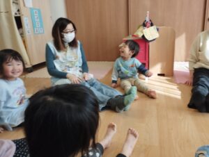 2人1組になり手をたたいたり、園になって先生の真似をすると楽しかったようでニコニコ笑顔😆
