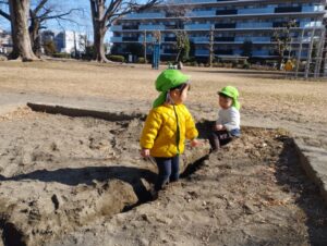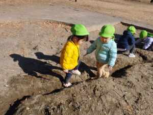 砂場の方に行くと、穴が深く掘られていて道ができていました!