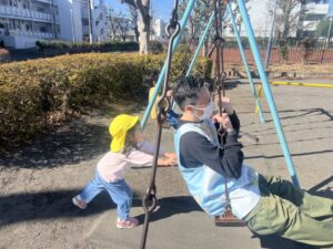 ブランコに乗っていると「パパもブランコに乗って〜」と言って仲良く3人でブランコに乗ります☺️