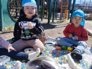 いつものおやつも外で食べると特別な気分でより美味しかったようです❣