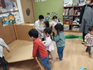 これ、どうやるの〜?大きいクラスのお友達が、手を繋いでくれました😊可愛い〜💓