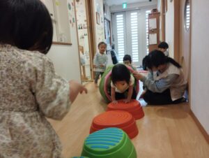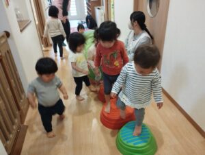ピアノ、スズ組さんは廊下でトンネルやバランスあそびをしましたよ!