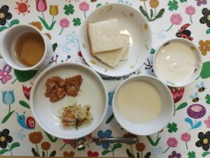 今日の給食🍚・食パン・タンドリーチキン・キャベツとツナのサラダ・コーンスープ・ヨーグルトでした✨